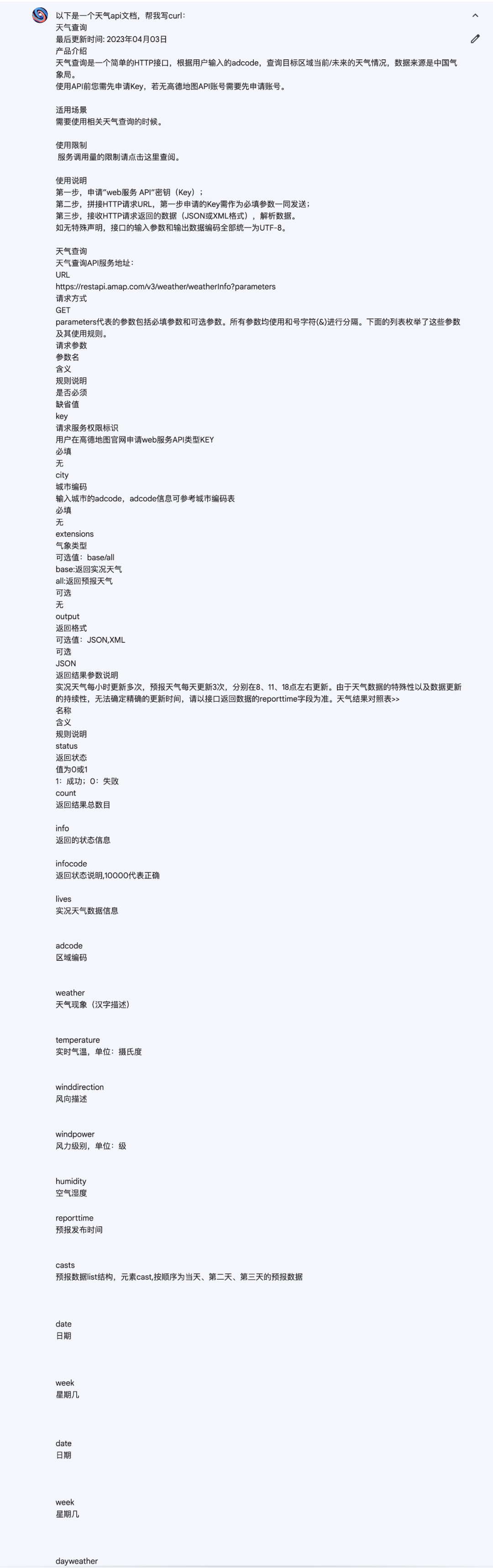 (1)我将高德天气api对应的链接:https://lbs.amap.com/api/webservice/guide/api/weatherinfo的内容,发给了bard,让它写curl文件。(这里用bard,没有特别意思,主要是poe和GPT也都在处理其他内容)