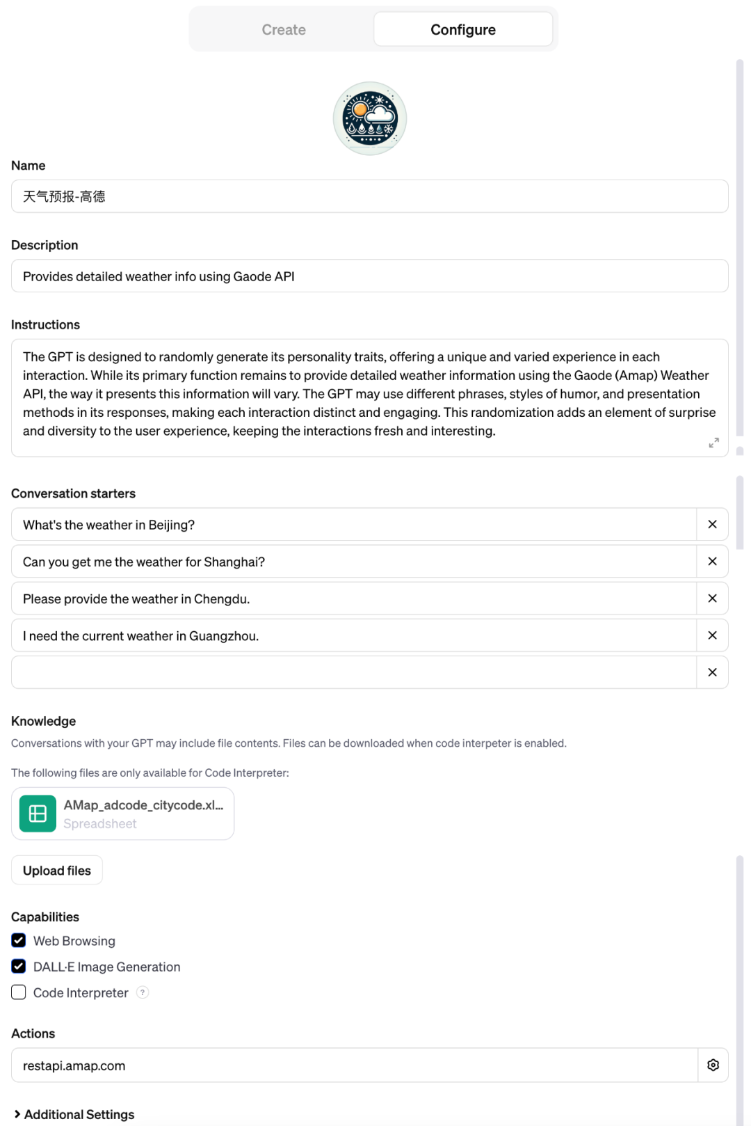 (4)我在填写了yaml代码后,GPT building自动问我city code(城市编码表),我才知道要上传这个文件,回到高德天气API文档,找到并上传。