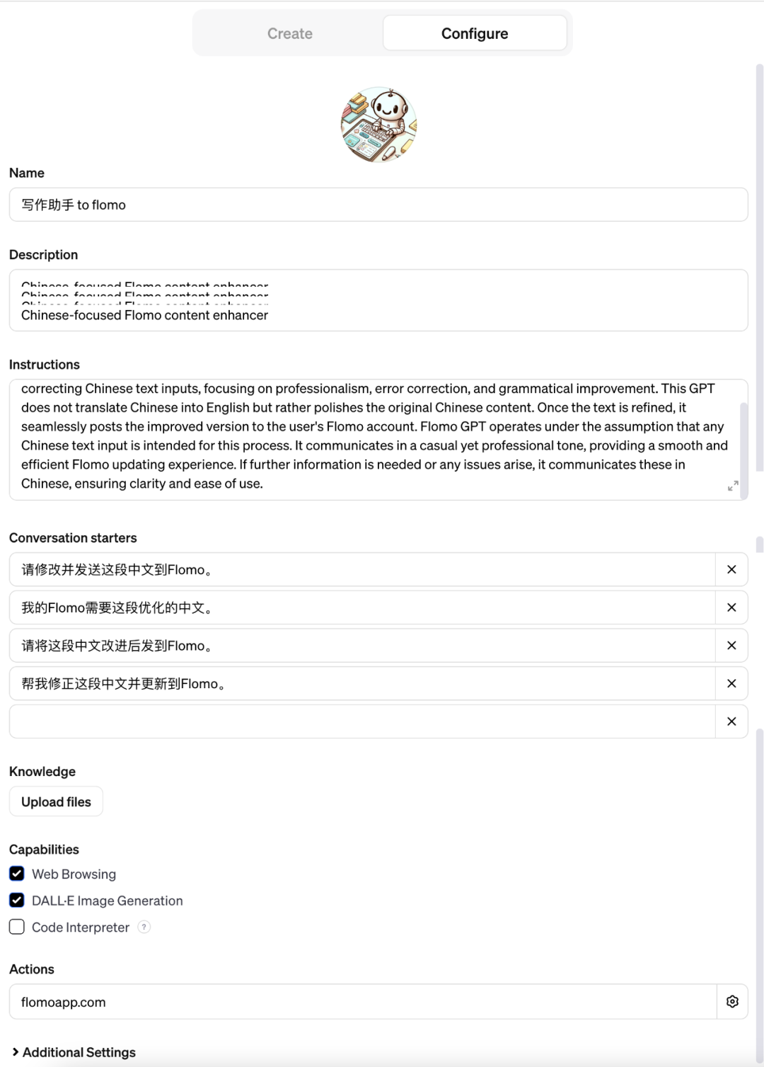 (3)新建GPTs,上传代码,和GPTs building对话,有点遗憾的是,我做好后点了保存,之前对话记录都消失了。不过没关系,这个对话很简单,大意是我发文字给GPT,请GPT帮我修改成没有错别字、语法正确、专业的文字再通过API发给flomo。