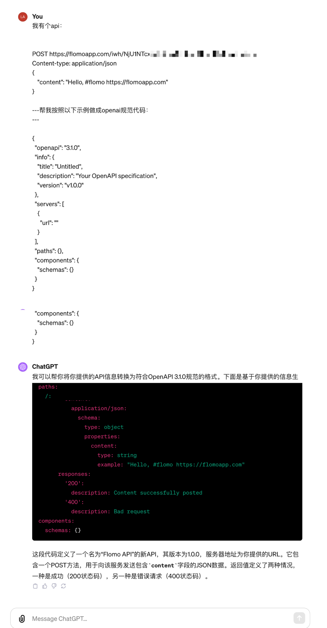 (2)将写好的curl发给Claude让它帮我生成OpenAI规范文档,这里我是将Actions里schema的示例天气发给了它。