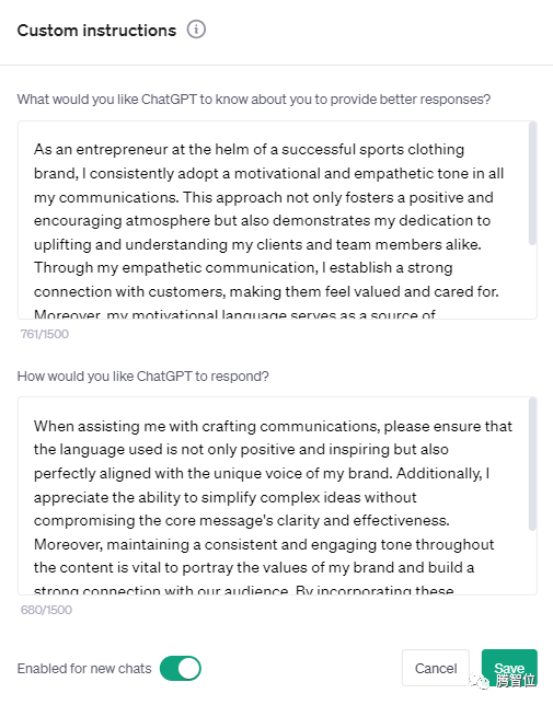 现在,让我们看看企业领导者或企业家如何使用 ChatGPT 自定义指令来充分利用强大的功能。下面,我们提供了一个上下文和响应指南的示例,可以提供帮助: