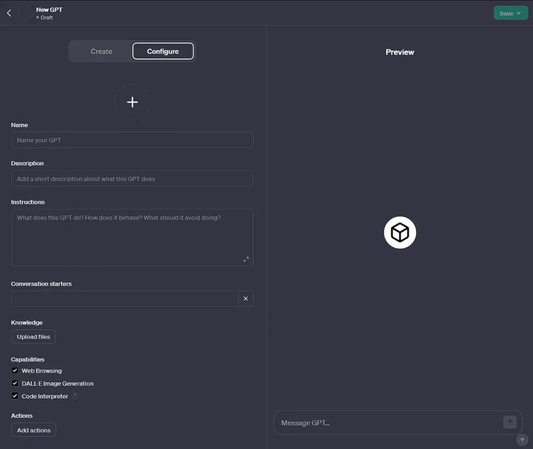 接下来的关键阶段是在“配置”选项卡中。在这里,您将赋予您的GPT身份和目的,指定名称和描述。这也是您选择GPT将执行的操作的地方。这些操作可以包括从网页浏览到创建图像,具体取决于您的需求。