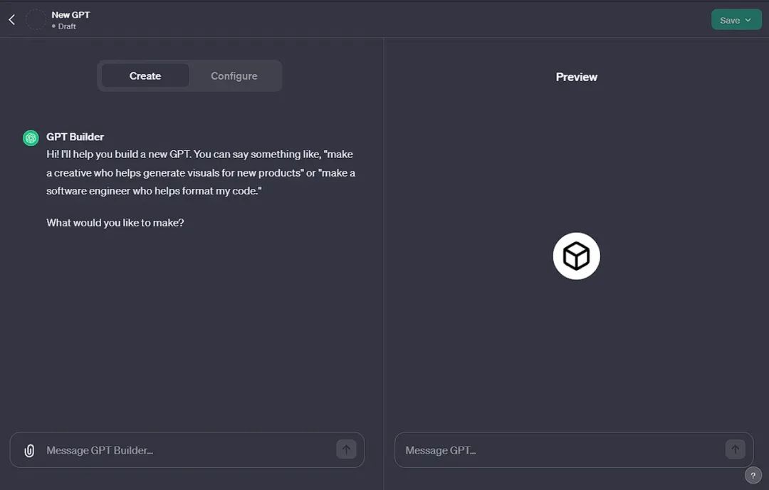 - 在“创建(Create)”选项卡中,您可以与GPT Builder交流,协助您构建一个新的GPT。您可以说:“创建一个创造性的助手,用于设计新产品的视觉效果”,或者“创建一个软件工程师机器人,用于格式化我的代码”等等。