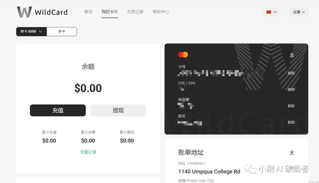 按照官方页面的引导填写 WildCard 虚拟信用卡的相关资料即可,账单地址在 WildCard 右上角可以找到。
