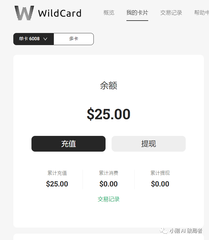 WildCard 最低支持充值 25 美元,建议第一次充值 25 美元,因为在首次绑定 OpenAI API 时会预付费 5 美元。