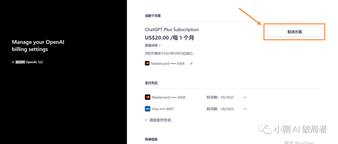 在打开的 "Manage your OpenAI billing settings" 页面,我们选择 "取消方案"按钮。