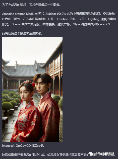 2、使用Dall·E3精准模拟MJ,生成4张图片,但是Dall·E有限流,并共享GPT4的限流,也就是说,说多了啥也用不上,3小时50次,并且设计差MJ很远,但是对于普通需求来说,也足够了。