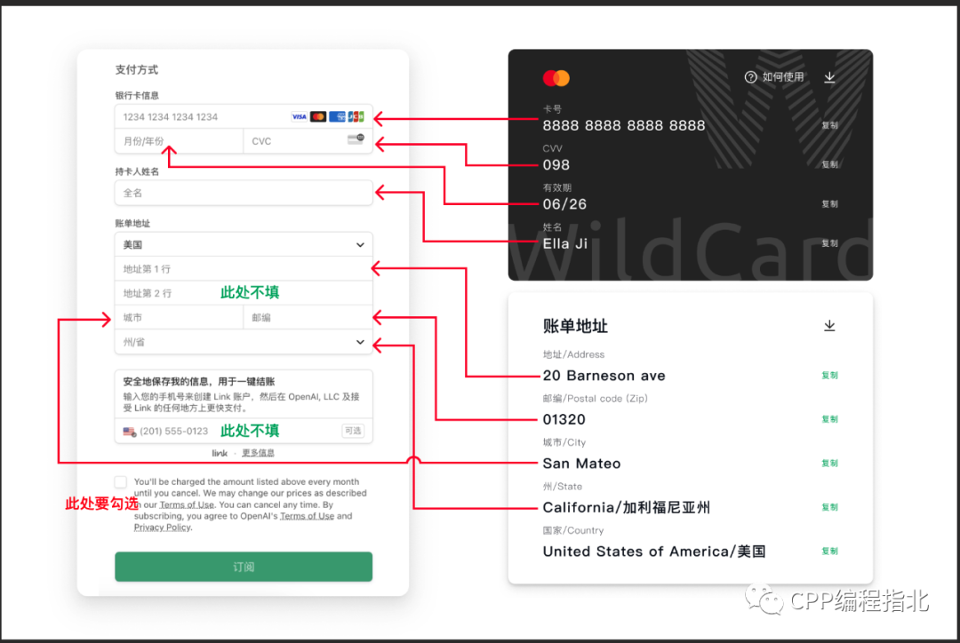 在弹出的 Stripe 绑卡页面,依次填入您的 WildCard 卡号、有效月份/年份、CVC(即您的 CVV )、姓名拼音(名字拼音在前,姓氏拼音在后,中间一定要有空格)和我们提供的美国账单地址。