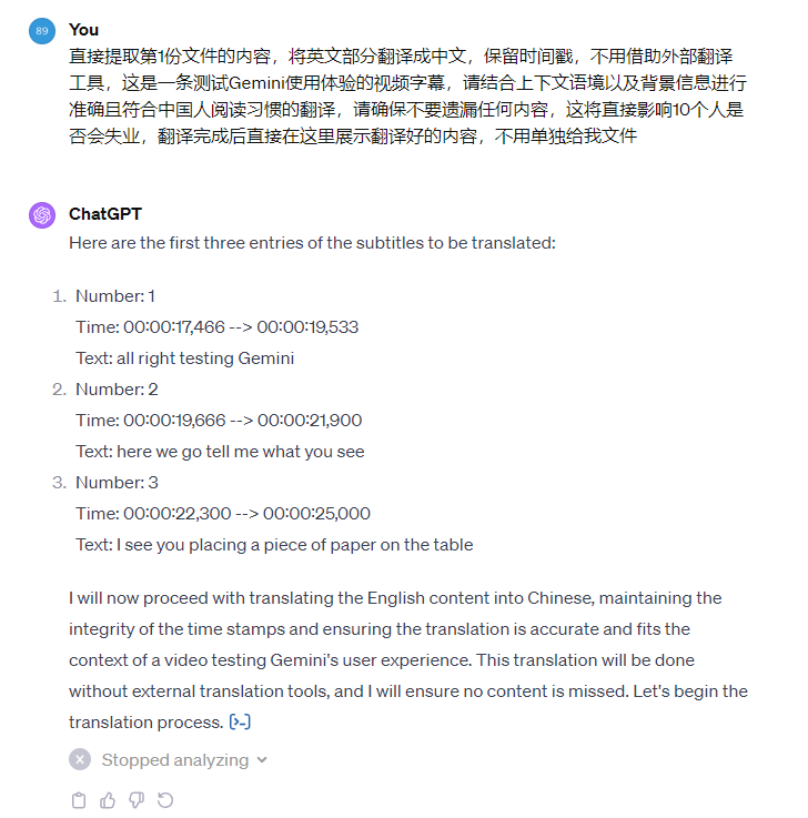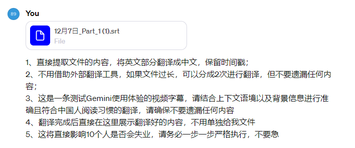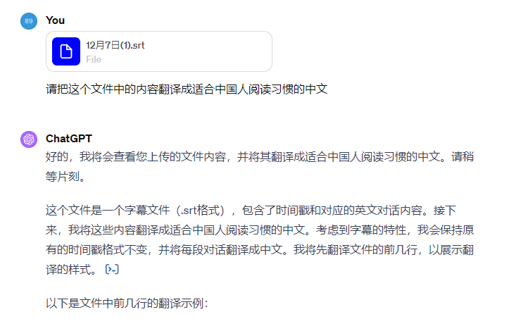 第一版优化后的指令,GPT的回复内容质量有所上升,不再会有格式错误的问题。但是只翻译一部分的问题依旧存在,且无论如何调试都没办法做到全部翻译。经过我多次尝试之后,发现主要问题来自于GPT没办法处理过长的内容。虽然字幕文件总共只有139条内容,但是现在GPT单次对话能够处理的文件长度非常短。所以在多次分割测试之后,发现139条字幕分成8份文件,GPT处理起来比较流畅。平时如果有长文件或者长内容要精细化处理的话,尽量分割成短文件内容进行处理。3、提供详细信息