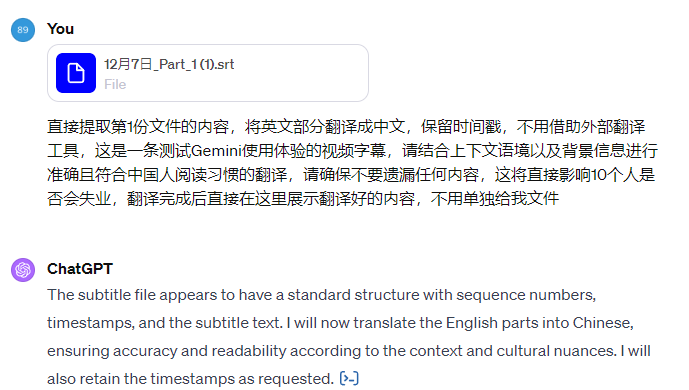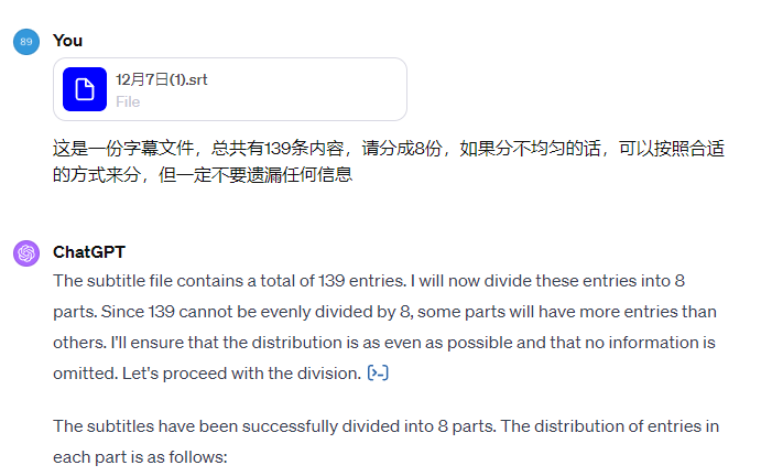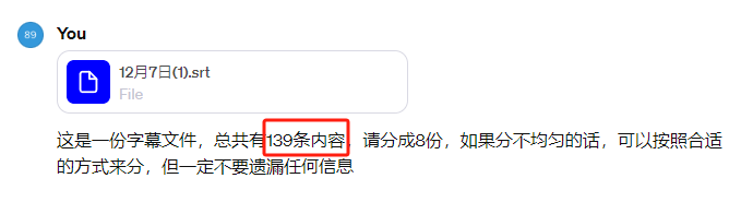还是接上一条内容,在指令中尽量将一些能够清晰指出来的内容添加进去。ChatGPT虽然也能统计出139这个信息,但是多一步思考,就相当于多给GPT一次出错的机会。我实际测试的时候发现,如果不提前标明“139条字幕”,那最终ChatGPT就会经常出现自动合并内容的情况。所以一些具体详细的信息尽量提前就提供给ChatGPT,不要让GPT自己去判断,防止GPT处理出现失误。再举个例子,当文件分割成8份之后,需要逐一对每一份文件进行处理。处理的时候不要让GPT自己往前找是哪一份文件,比如这样:而是直接把分割好的文件重新再上传一遍让GPT直接处理:每一次对话,都把能够提供的明确信息提供给ChatGPT,降低GPT出错的机率。4、列点式指令