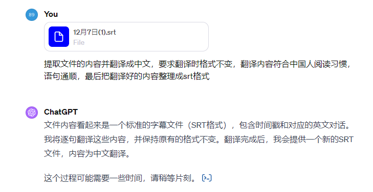 也就是这篇文章《效率爆表!手把手教你用ChatGPT配字幕!》里所展现的各个环节。到这一步,就能够保证ChatGPT高质量回复,同时还能保证稳定性。其实上面这些技巧,归根结底就一个核心:缩短ChatGPT单次思考的路径。无论是细化任务步骤、分割文件还是提供详细信息、分解子任务,都是围绕着这个核心出发的。降低ChatGPT单次执行任务的难度,以保证ChatGPT在单次对话中能够会回复出更高质量的内容。就比如最近这段时间,GPT会经常出现用英文回复的情况。在不影响使用的情况下,我们就可以不用特意强调使用中文,或者当ChatGPT用英文回复完之后再让它翻译成中文。这样原本ChatGPT一次完成两个任务就变成了分两次来完成。