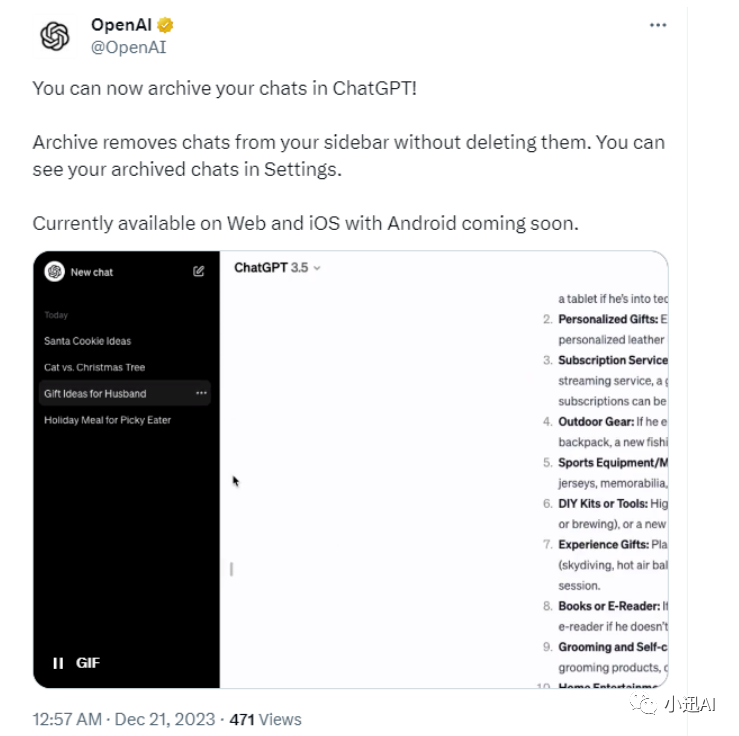 目前,这一功能仅在OpenAI网站和iOS系统上可用。不过,OpenAI表示,他们正在积极开发安卓系统上的存档功能,并计划在未来推出更多平台支持,让更多用户能够享受到这一便利的功能。