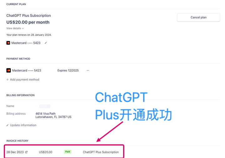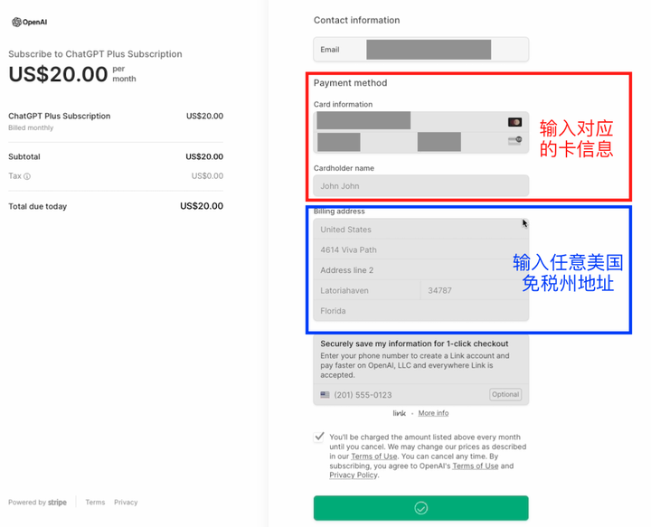 4 使用卡号信息在ChatGPT开通会员,地址选择美国的免税州。