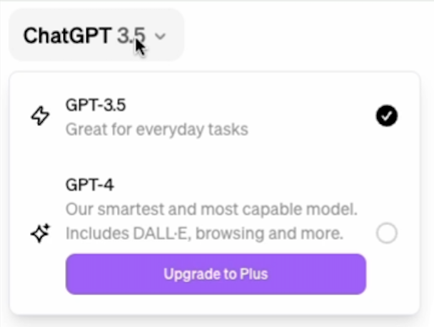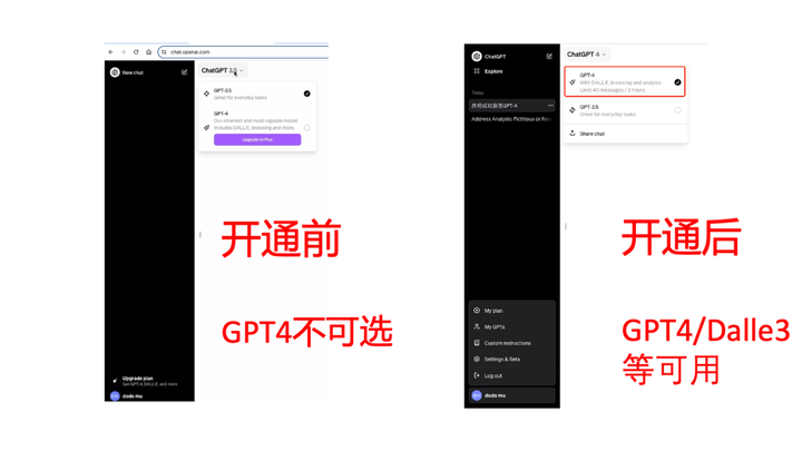 然后升级后的账号是下图右边这样的,可以选择GPT3.5或者GPT4。