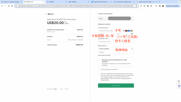 ChatGPT充值页面其实非常的简单,就是「有张可以支付的卡」+「任意一个国外的地址」,并且输入下面指示的必要信息就行: