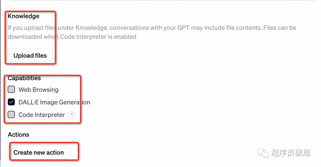 知识库(支持上传文件),Capabilities:web浏览,图片生成、代码解析(这个结合下面的Actions可以做出高级的功能)