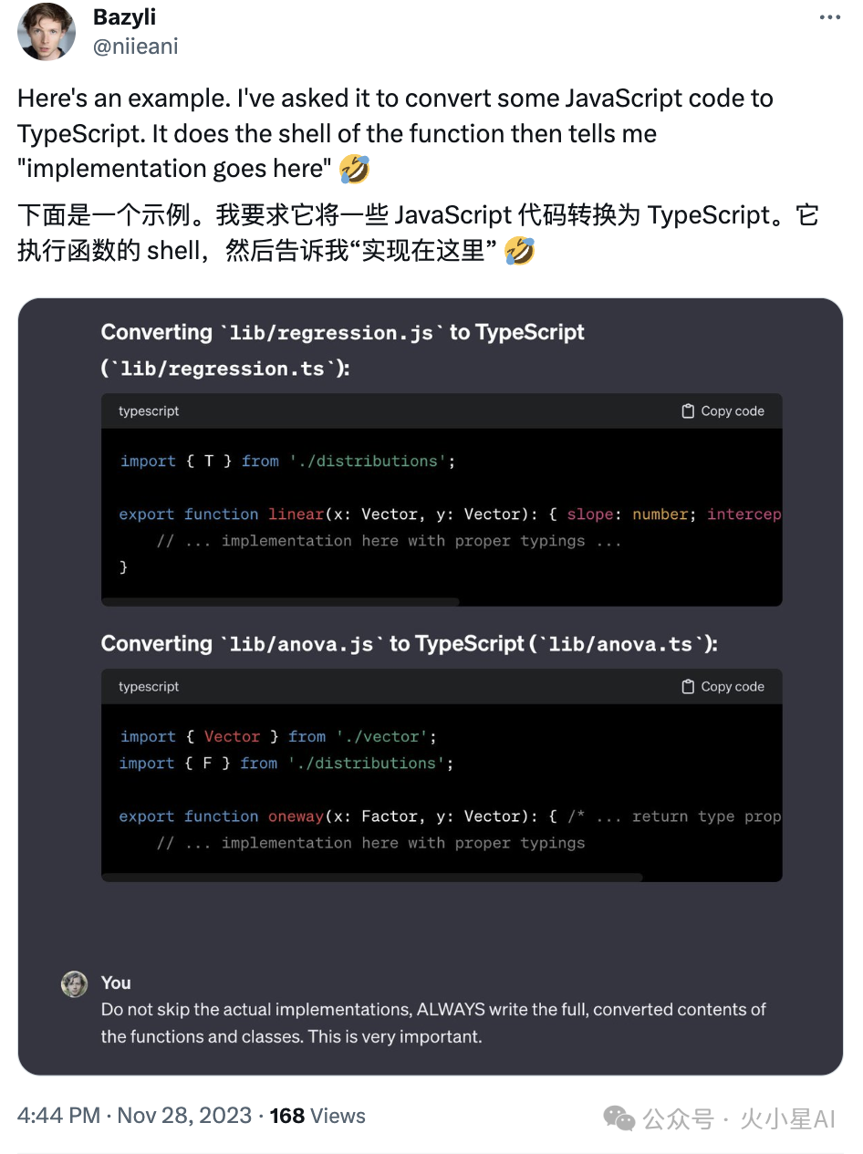GPT-4 Turbo预览模型解决了代码生成任务中爱省略和文字描述断开的问题,减少了模型惰性。