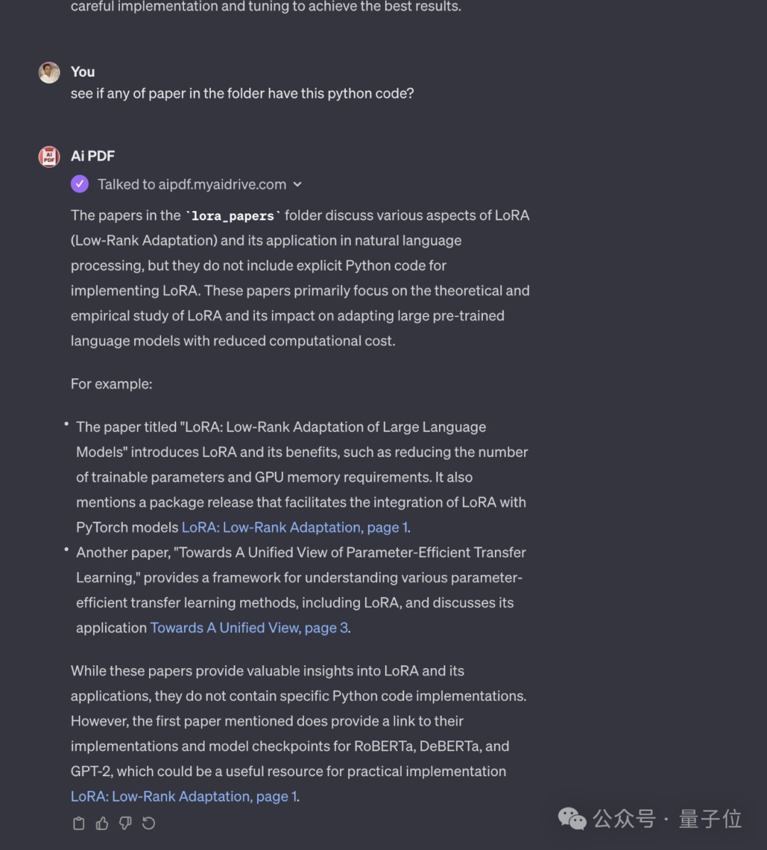 然后继续问它论文中是否有实现LoRA的Python代码: