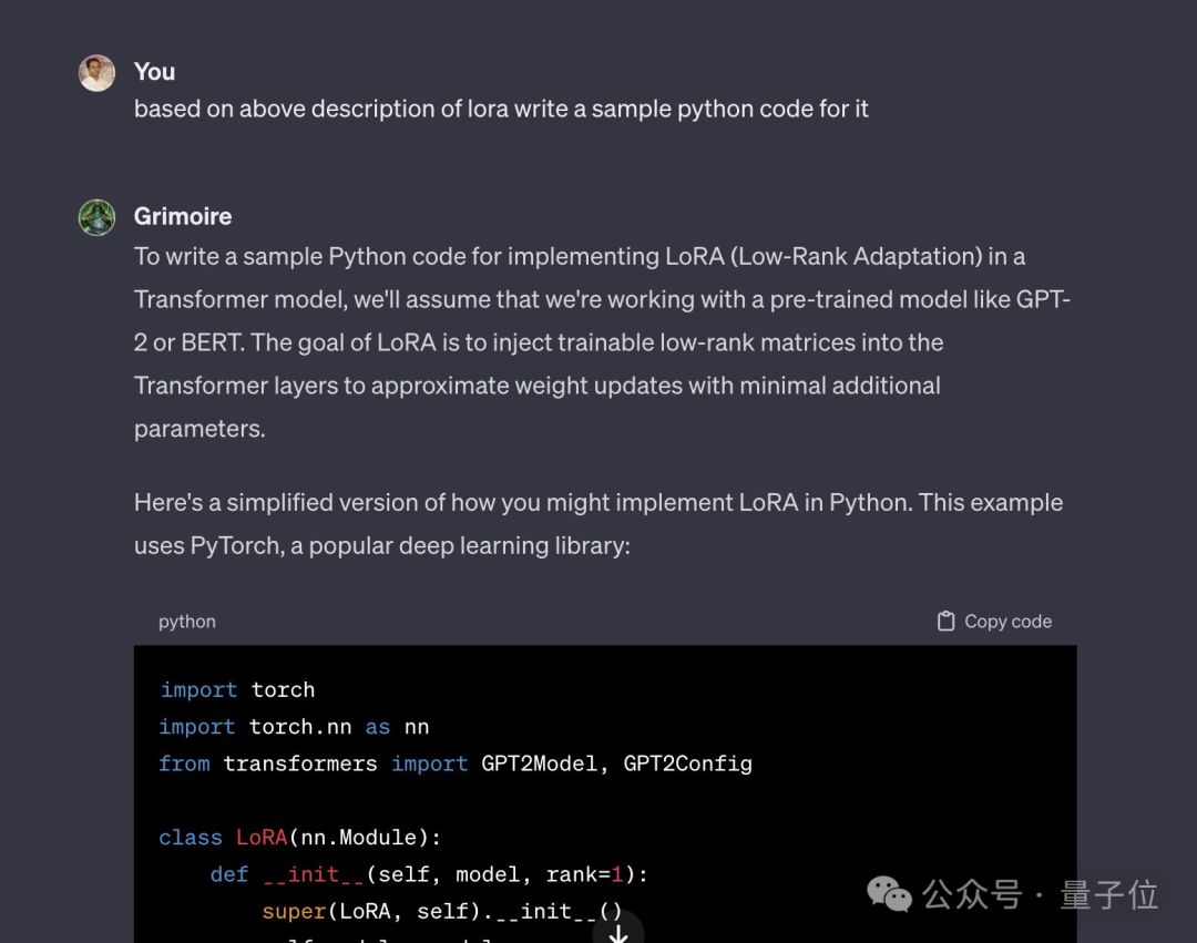 结果Grimoire真的给出了一个在PyTorch中实现LoRA简化版的Python代码: