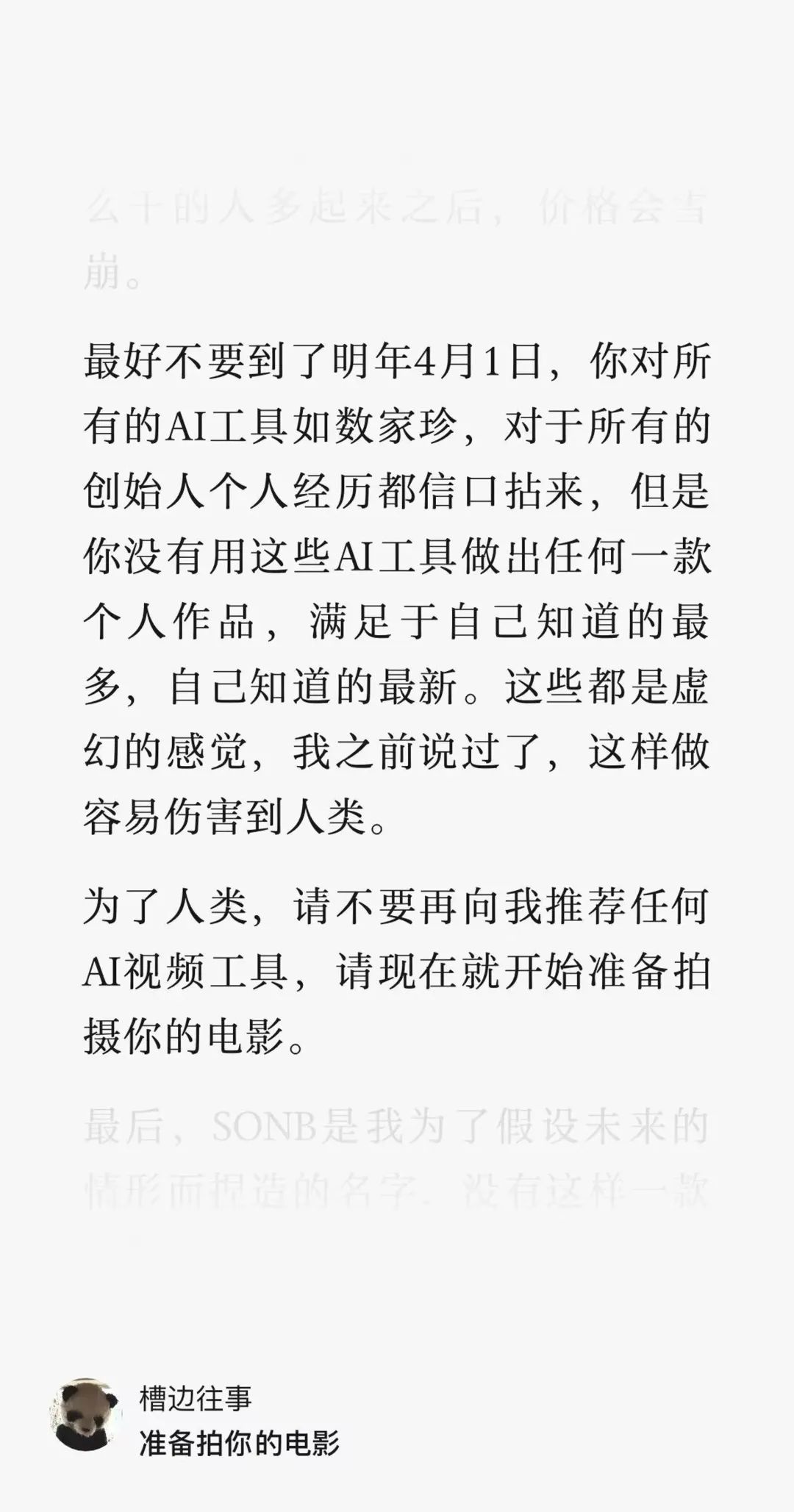 此前我们对 AI 生成的视频是抱有宽容的,我们知道现在技术还不够强,所以我们以更低的标准去评价这些视频。此后这种特定的宽容将变得不复存在,甚至会出现地位互换“那个视频确实一般,但考虑到是纯天然拍摄的,我觉得还是不错的啦。”