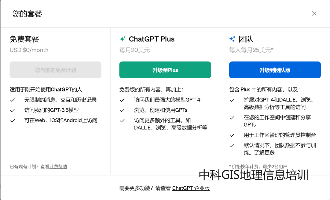 默认选择的是ChatGPT 3.5,如果想升级可以单击左下方的升级按钮,升级4.0套餐,价格如下: