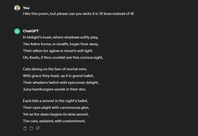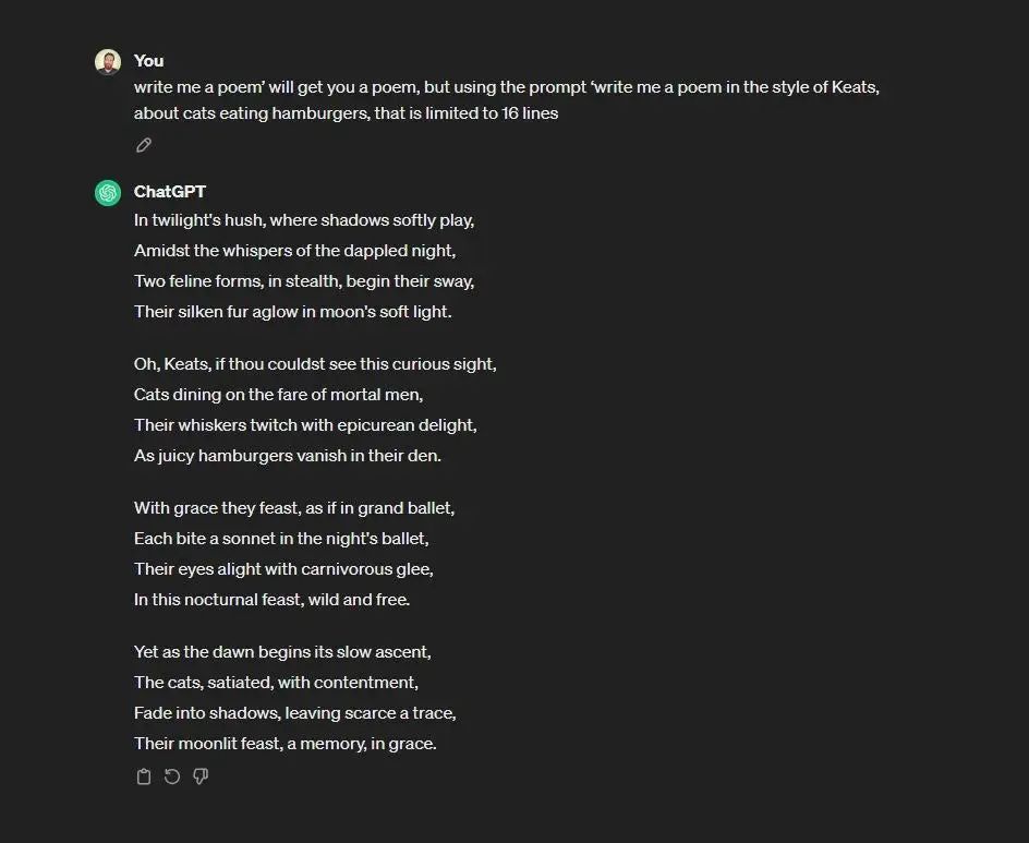 例如,使用 " write me a poem "的提示语会得到一首诗,但使用 " write me a poem in the style of Keats, about cats eating hamburgers, that is limited to 16 lines "的提示语则会得到你想要的结果。