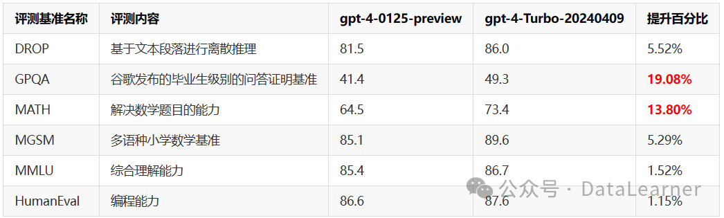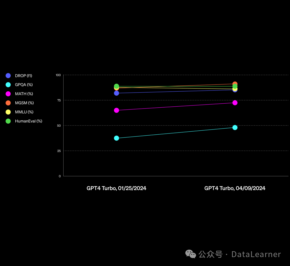 注意,这些都是使用最简单的Prompt进行测试的结果,也是OpenAI自己发布的最新测试结果。从这个评测看,在数学图例方面,gpt-4-turbo-2024-04-09版本的模型都有不同程度的提高,最高可以提升19%!要知道GPT-4本身已经十分强大,这个提升幅度,在不变更版本号的前提下十分难得。而综合理解和代码能力就提升不明显。
