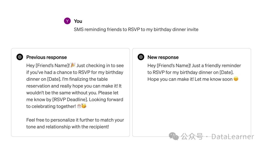 官方给了一个实例,说明最新的GPT-4对话能力更强,也不那么啰嗦。例如,让GPT写一个短信邀请朋友参加生日聚会: