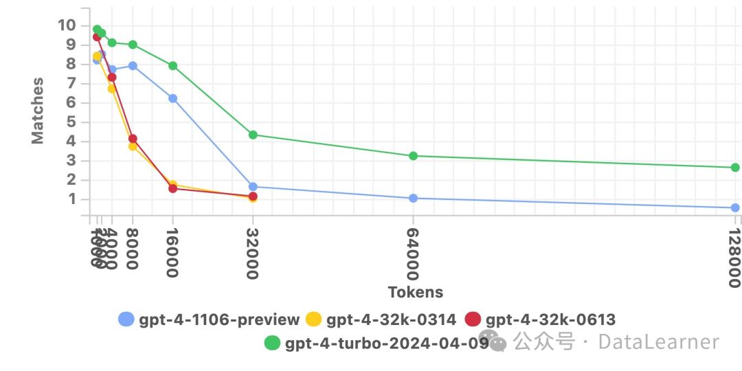 和此前的gpt-4-1106对比,新版本的GPT-4-Turbo-2024-04-09在更长的上下文上表现提高。64K的上下文水平与此前版本的26K差不多!