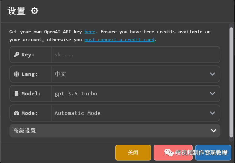 2、点击左下角设置【Settings】,进入到设置页面,在【key】填入自己在ChatGPT中获取的key,【lang】选项选择中文,【Model】选择调佣的ChatGPT版本,可默认,【Mode】选项默认。最后点击 save 保存。