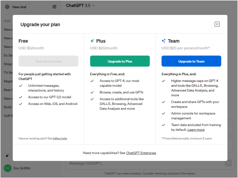 升级的费用为 20 美元/月。ChatGPT不提供试用。付款并登录后,使用界面看起来和以前一样,从顶部菜单中选择 ChatGPT 4即可使用图像生成功能。