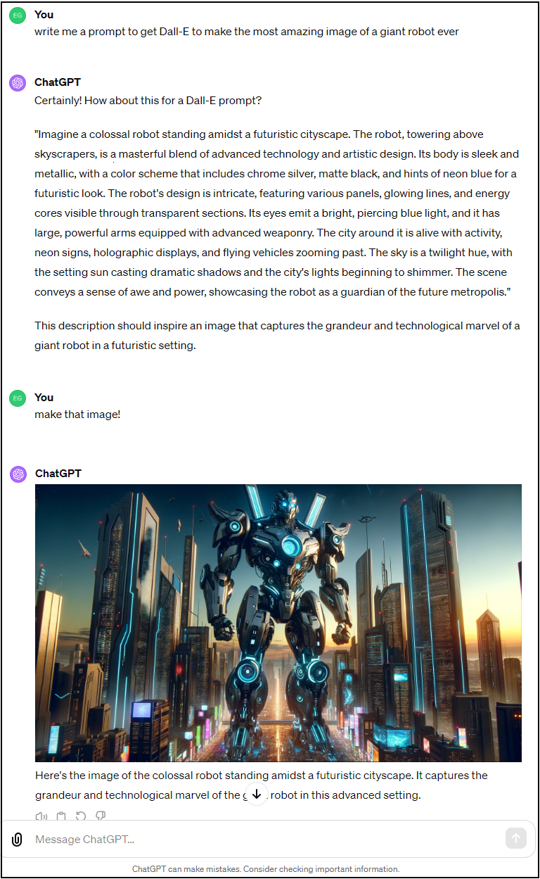 当然,你也可以让ChatGPT帮你写,你可以给它机构关键词(比如 "惊人的巨型机器人")为你写一个 Dall-E 的提示。它会生成一个充满你可能没有考虑到的细节的提示。