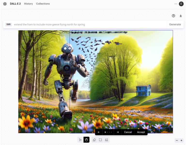 在 Dall-E 2 中,用户可以选择 "画面扩展"(Outpainting)功能,该功能允许用户从一个初始的正方形图像开始,向四周扩展,从而创造出更多的人工智能生成的艺术作品。这个功能有点类似于 Photoshop 中的生成填充功能。