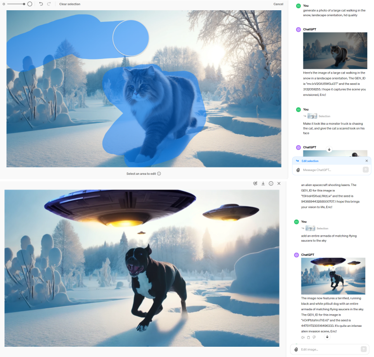 选择工具是可选的,你可以直接使用提示将猫改为狗。但要将其限制在图像的某个区域,你必须用文字指定,否则 Dall-E 3 有可能生成一幅全新的图像。