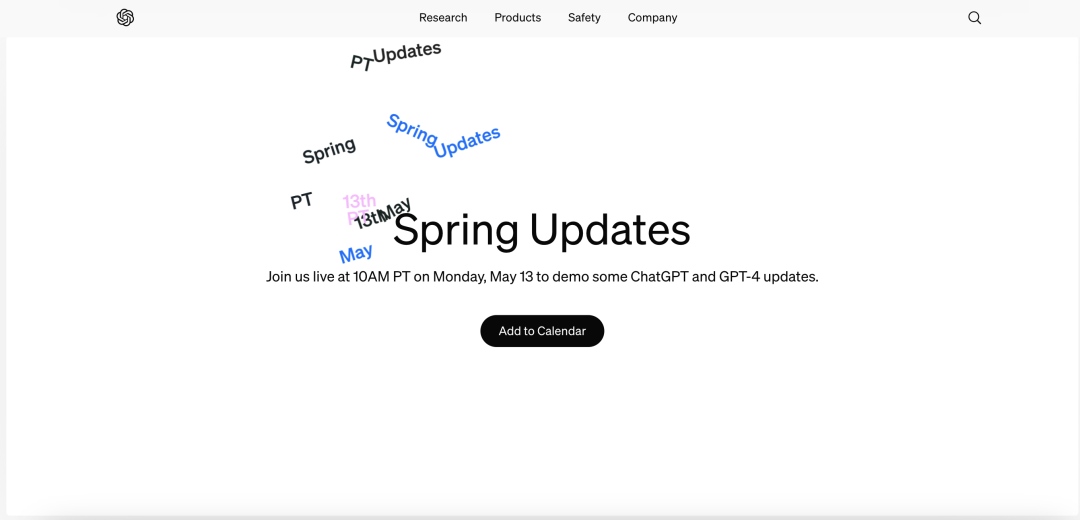 目前关于这场直播的信息已被添加到OpenAI官网首页的滚动轮播图的第一位。可以点击Add to Calendar将直播添加到系统日历中,系统会自动转化时区。