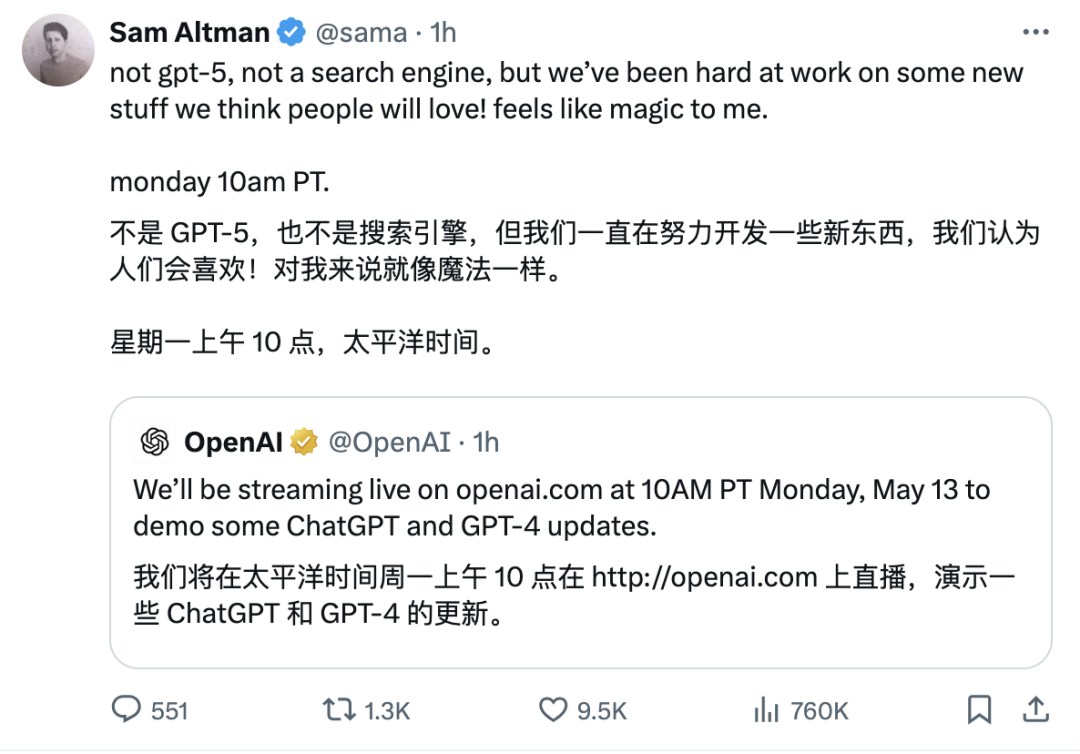 在OpenAI官方账号发帖后不久,OpenAI创始人兼CEO Sam Altman就转发了此条动态,并表示:“not gpt-5, not a search engine, but we’ve been hard at work on some new stuff we think people will love! feels like magic to me”,确认了本次直播内容不会是GPT-5,也不是前几天传的沸沸扬扬的AI搜索引擎,而是一些他认为像魔法一样的新功能。(Sam Altman,不愧是顶级营销大师啊...)