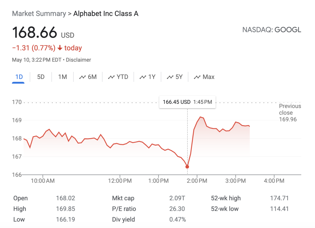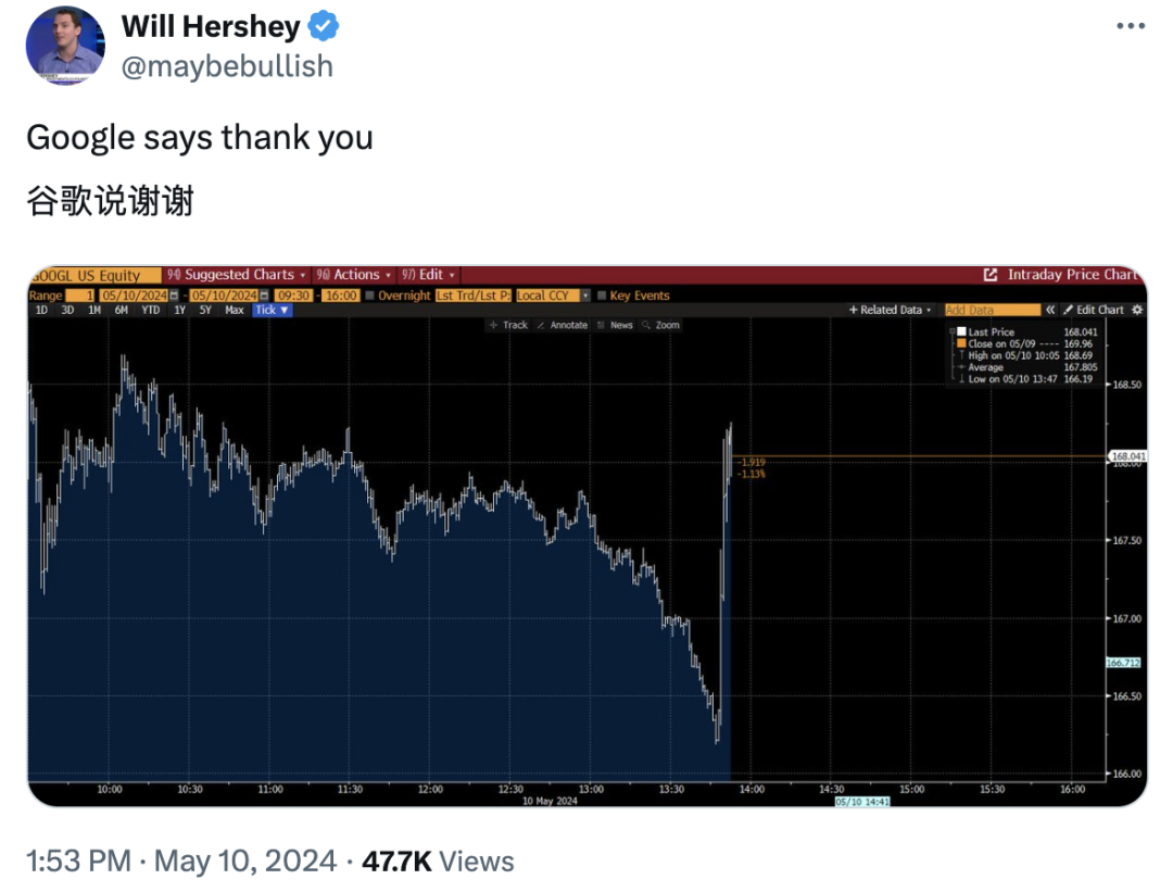 就在OpenAI发帖以及Sam Altman跟帖表示不会发布AI搜索引擎的几分钟后,谷歌股价应声上涨。网友表示:“谷歌应该说谢谢。”