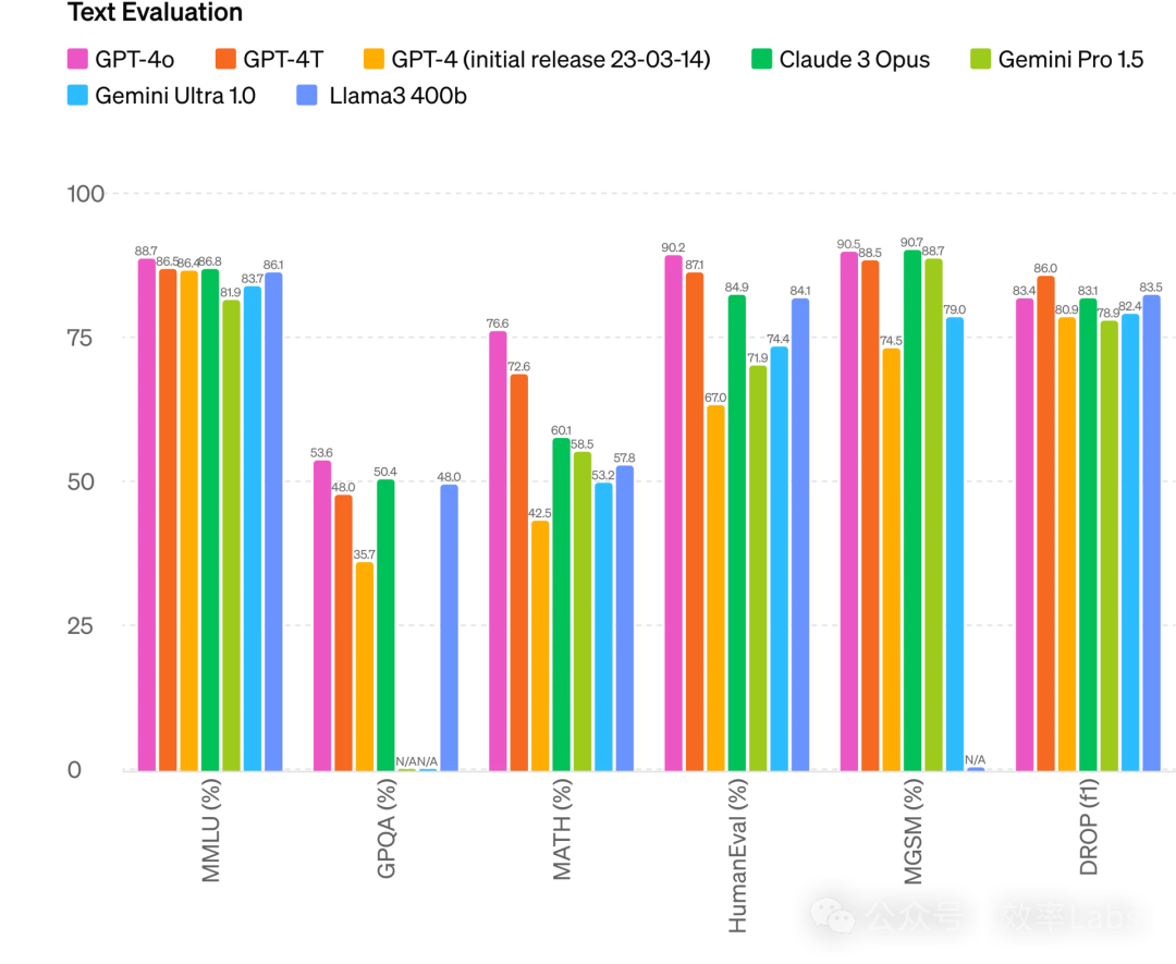我们可以看一下官方公布的GPT-4o在基准测试中的表现。