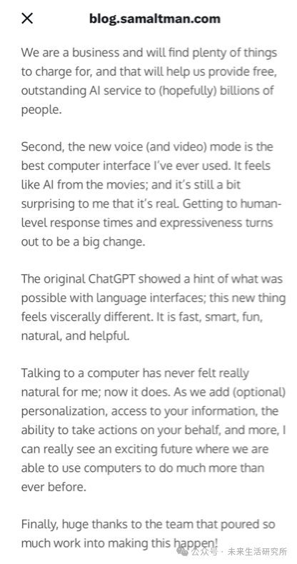 像这样逼真的人机对话,无疑之处就像是现实版的电影AI。OpenAI首席执行官Sam Altman在社交平台上说“这感觉就像电影中的人工智能一样……对我来说,与计算机交谈从来没有真正自然过;现在却如此了。”在网络直播的现场,开发人员们似乎十分享受和ChatGPT的互动,这也为整个演示增添了些许的欢笑元素。他们赞赏ChatGPT强大而出乎意料的功能,而ChatGPT则回应道:“哦别说了!你让我脸红了!”。