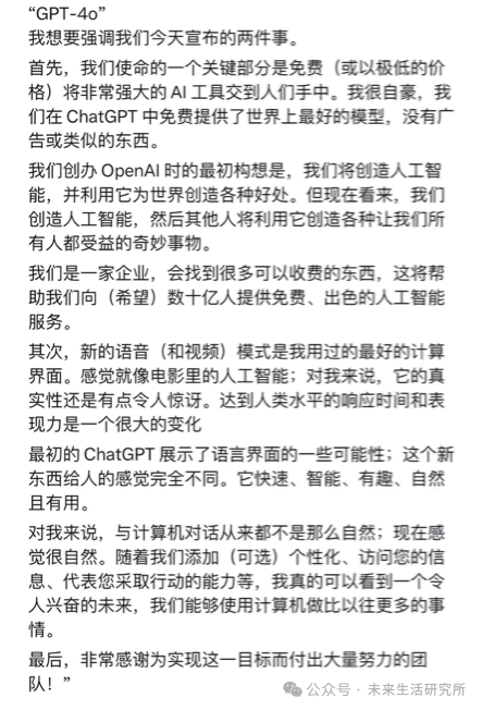 5月14日凌晨,OpenAI在线上视频发布会上发布他们新的人工智能模型 —— GPT-4o。这款模型带来了革新性的突破,具备进行逼真的语音对话以及实现文本与图像的交互能力。在激烈的竞争环境下,这一新模型标志着OpenAI在保持全球竞赛优势的道路上迈出的重要一步。