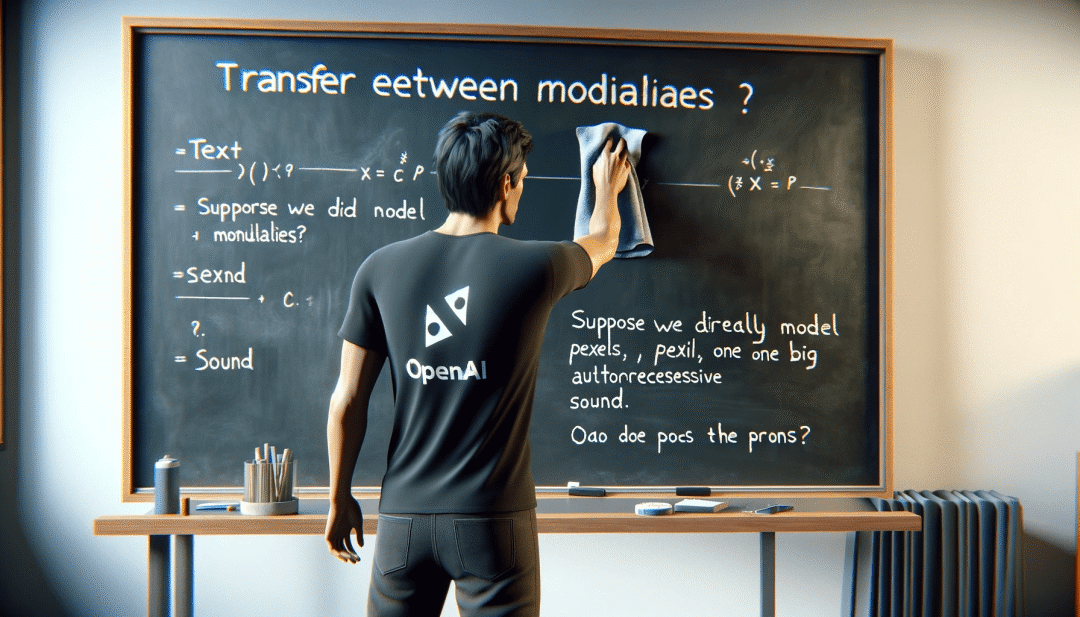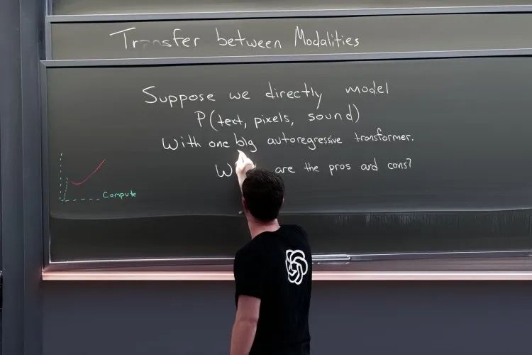 正如您将在下图中看到的那样,它非常逼真,显示一个穿着带有 OpenAI 标志的黑色 T 恤的人用布擦拭黑板,上面写着粉笔文字“在模态之间转移。假设我们直接用一个大的自回归变压器对 P(文本、像素、声音)进行建模。有什么优点和缺点?