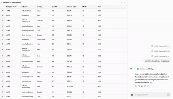 这样,用户就可以先选定表格中的区域,然后进行定向 QA 或者操作,比如让 ChatGPT 计算开支,并创建透视表。