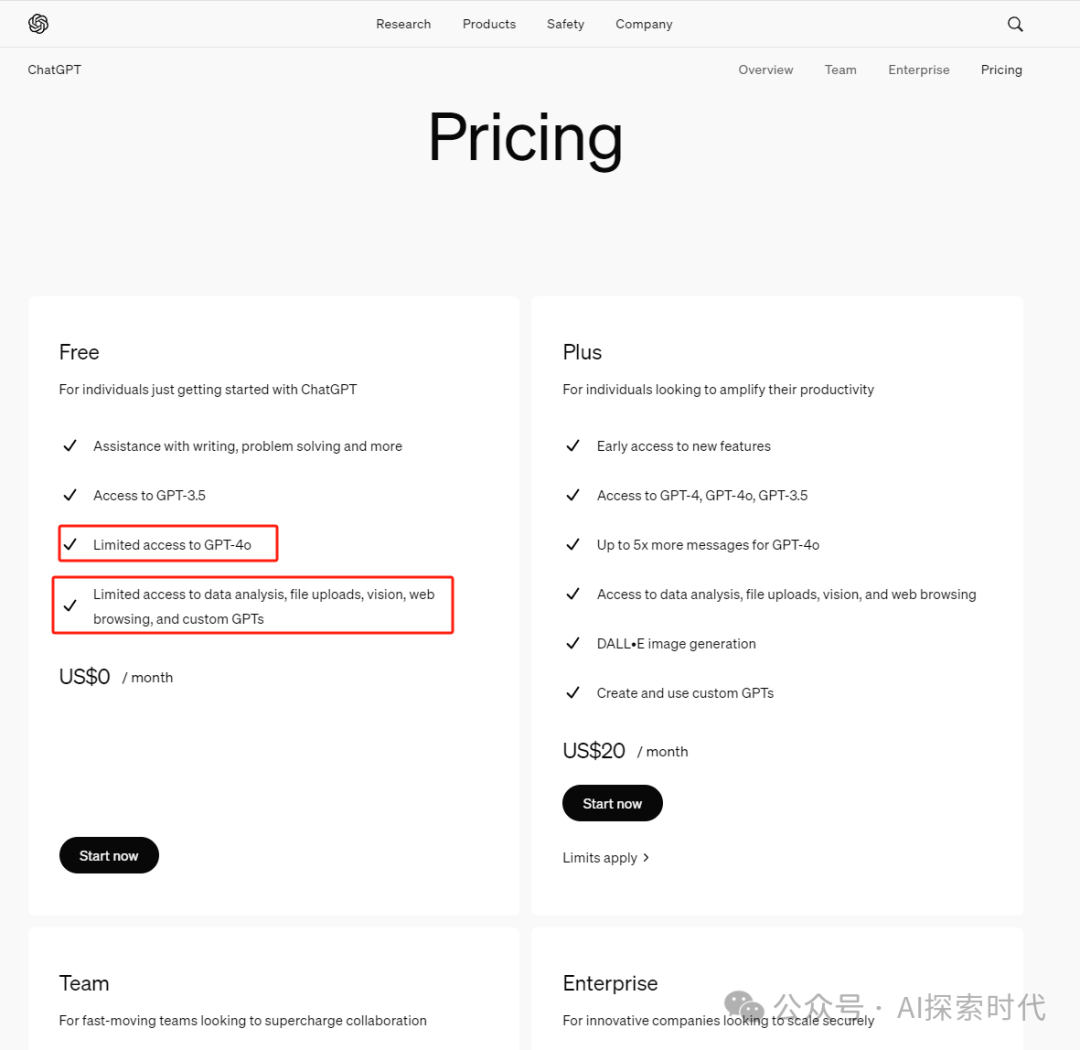 但是,看其官网介绍,如下图;GPT-3.5是完全免费的,并且不限次数,但GPT-4o是有次数限制的,也就是Limited access,而且其高级功能也是有次数限制的。