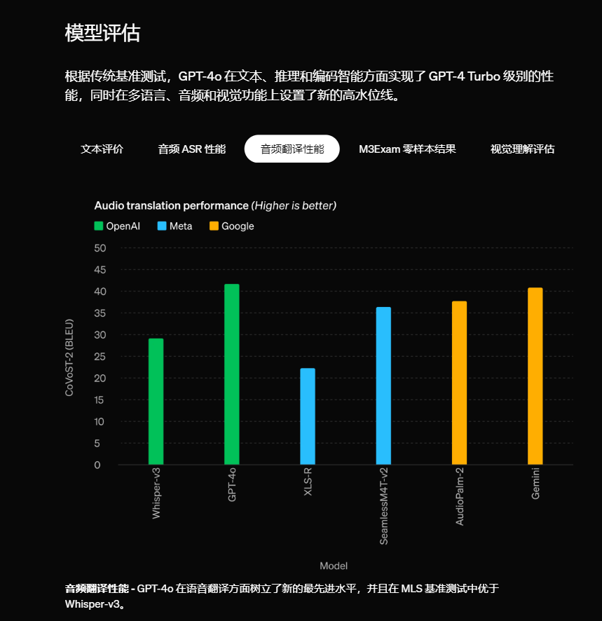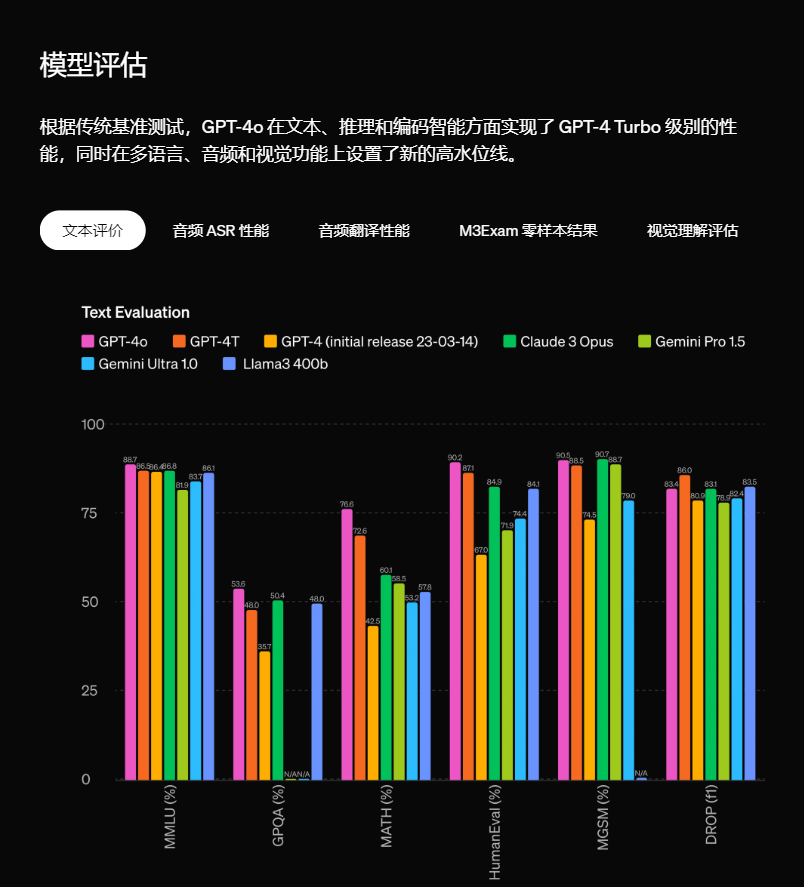 GPT-4o最大的亮点之一是其速度和性能的显著提升。与前一代模型相比,GPT-4o的响应速度大幅提高,最短响应时间仅为232毫秒,平均响应时间为320毫秒。这几乎达到了人类的反应速度,使得GPT-4o能够在各种应用场景中提供即时反馈。