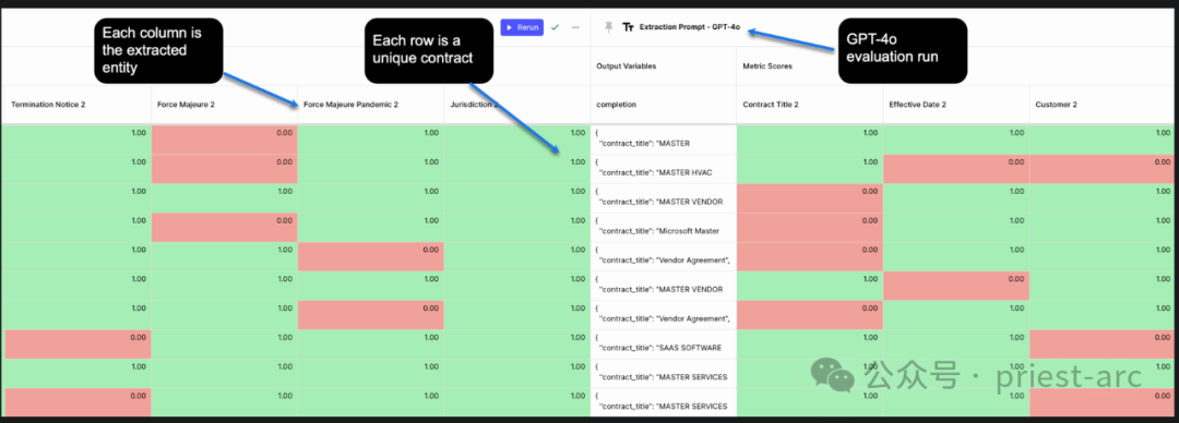 在本次评估中,我们将提取总共12个字段,如合同标题、客户名称、供应商名称、终止条款的详细信息、是否存在不可抗力等。通过对10份合同的真实数据收集,并使用设置了 12 个自定义评估指标。这些指标用于将我们的真实数据与模型生成的 JSON 中的每个参数的 LLM 输出进行比较。随后,我们对 GPT-4 Turbo 和 GPT-4o 进行了测试,以下是我们的评估报告结果: