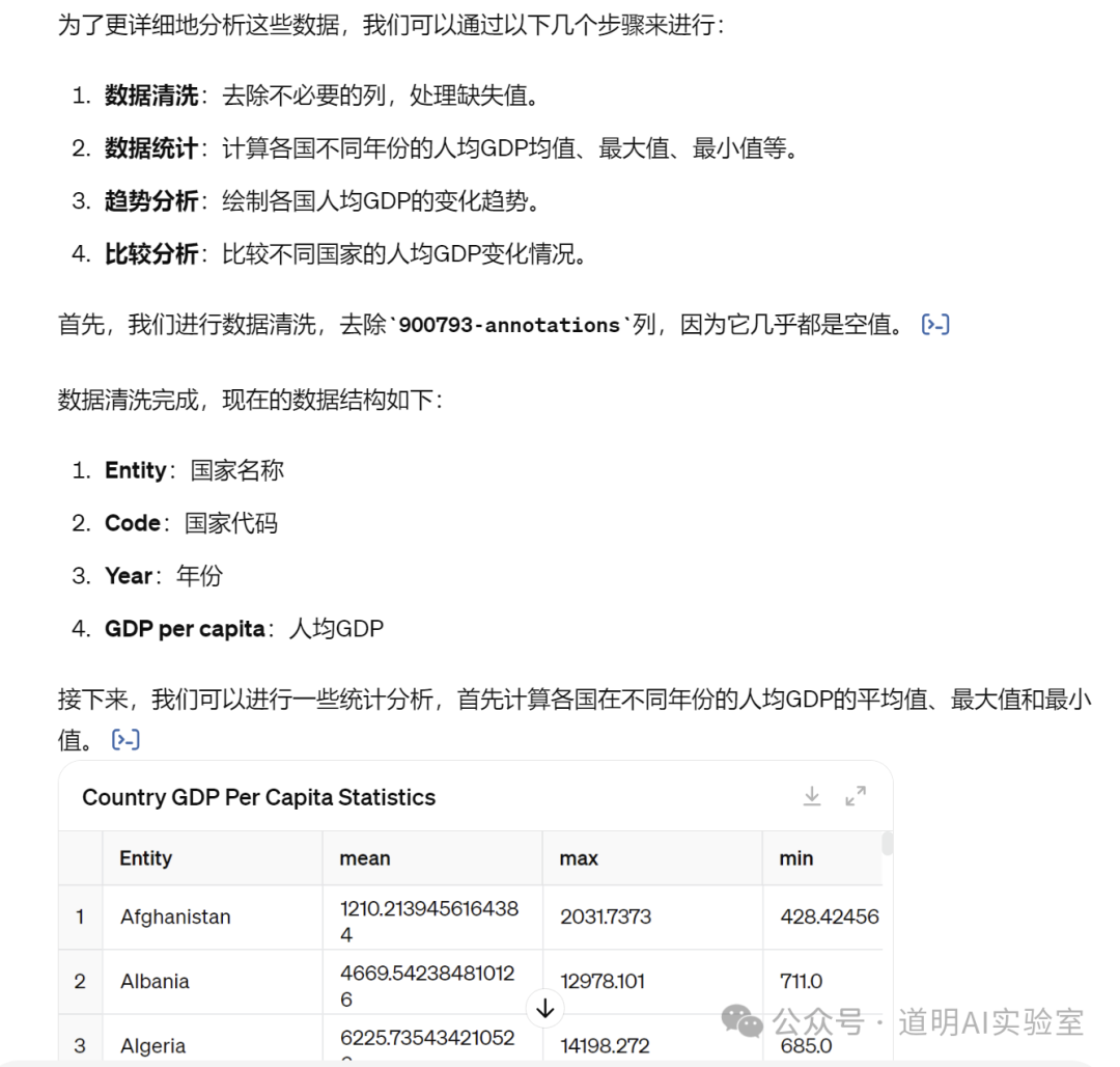 而紧接着的这一步开始体现了“Agent”的能力:数据清洗。我们的输入只是一个数据文件,和“请分析数据”的指令,后面的动作都是自动(automation)的,说背后是思维链,思维树也好,其他技术也罢,但是看着模型输出的过程,会让人觉得,它真的在“思考”,在“工作”。