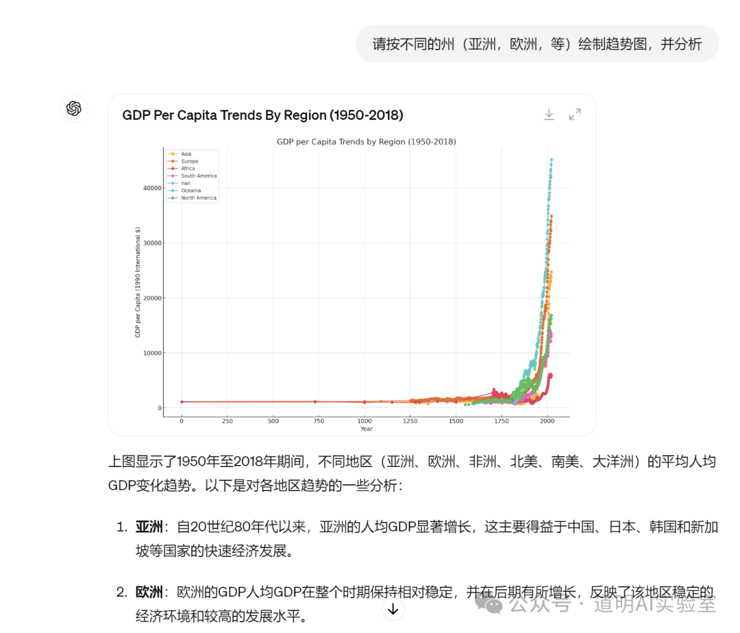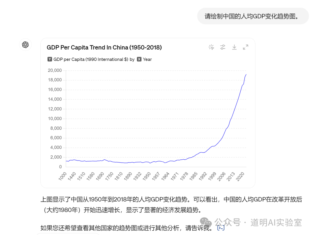 在模型输出第一段之后,会有一个提示选项是“请绘制中国的人均GDP变化趋势图”,所以我直接点击,把这个关联作为提示词,输出图表。