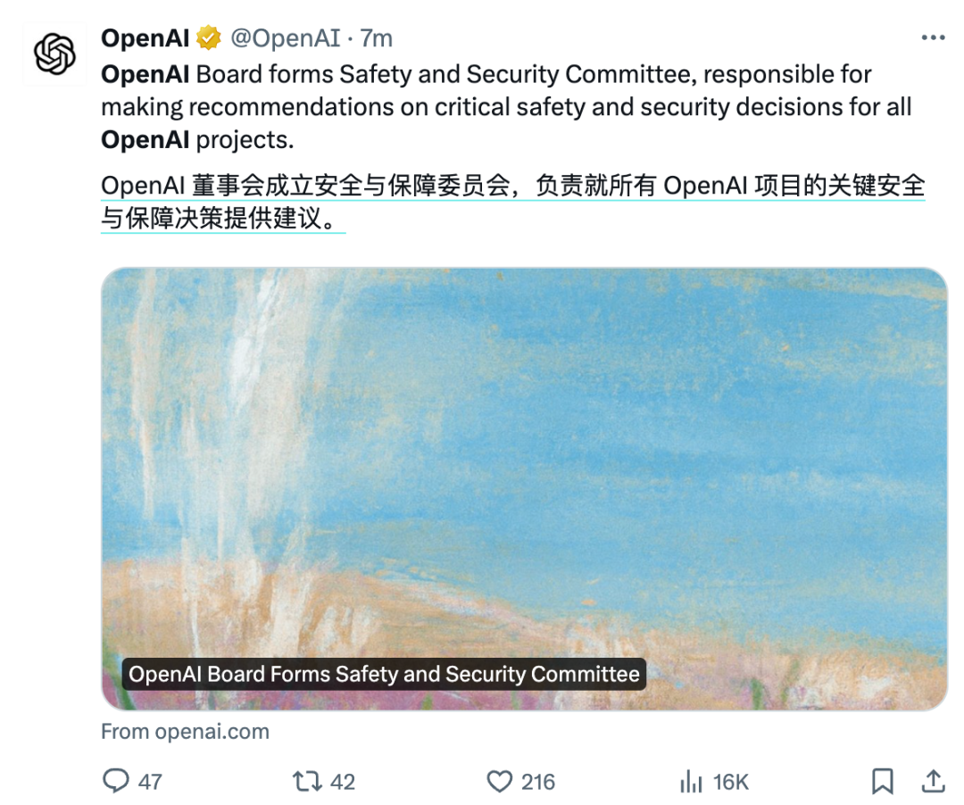 今天,OpenAI 董事会成立了一个由董事 Bret Taylor(主席)、Adam D’Angelo、Nicole Seligman 和首席执行官 Sam Altman 领导的安全委员会。该委员会将负责向董事会提出关于 OpenAI 项目和运营的关键安全决策建议。