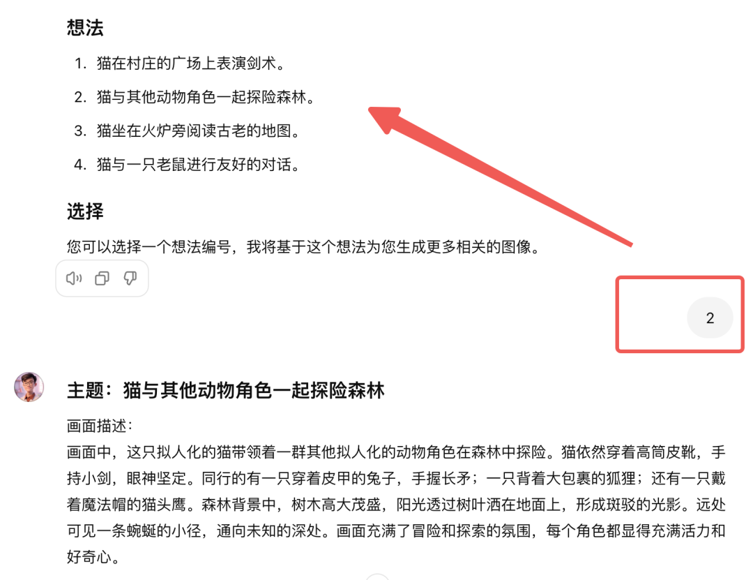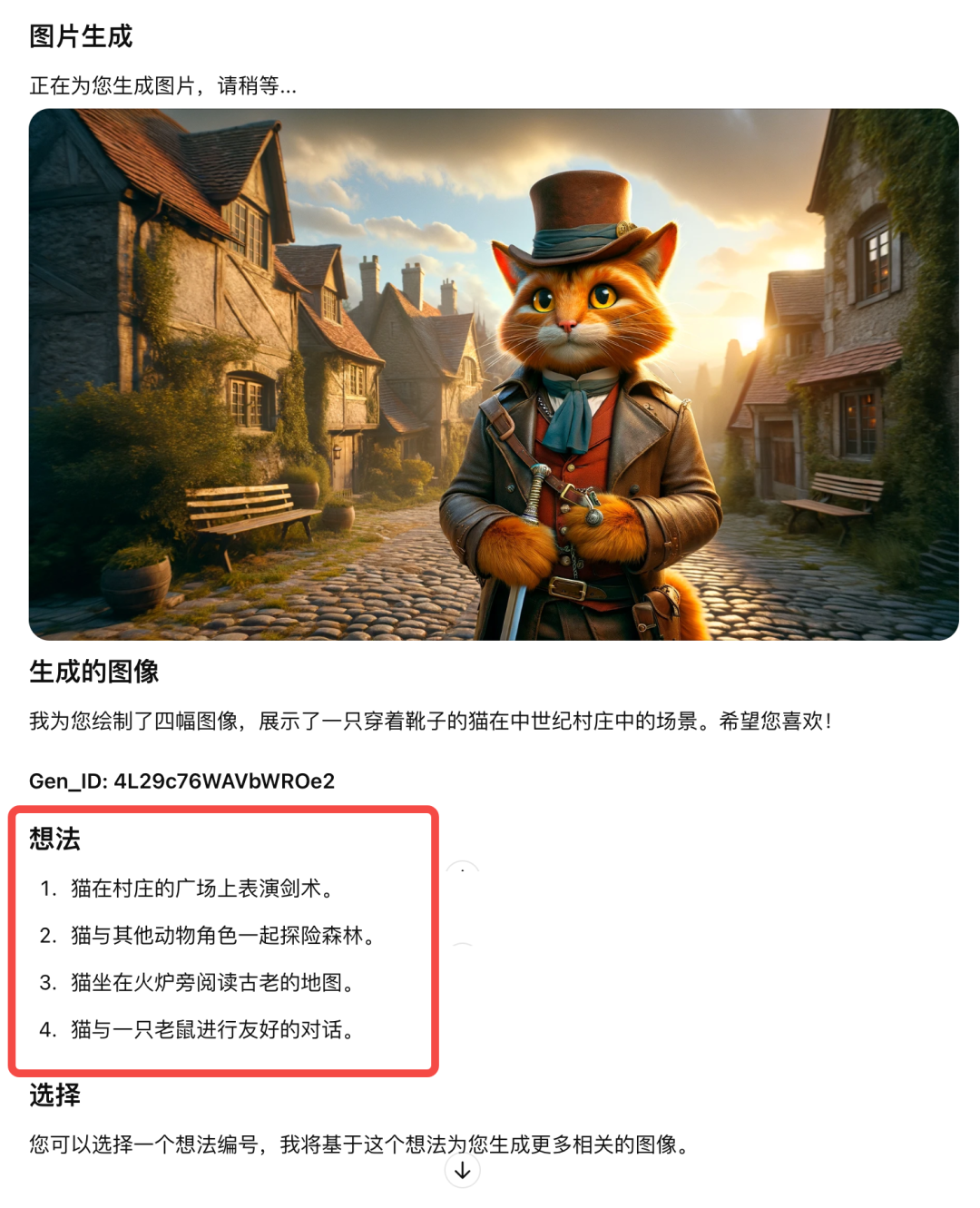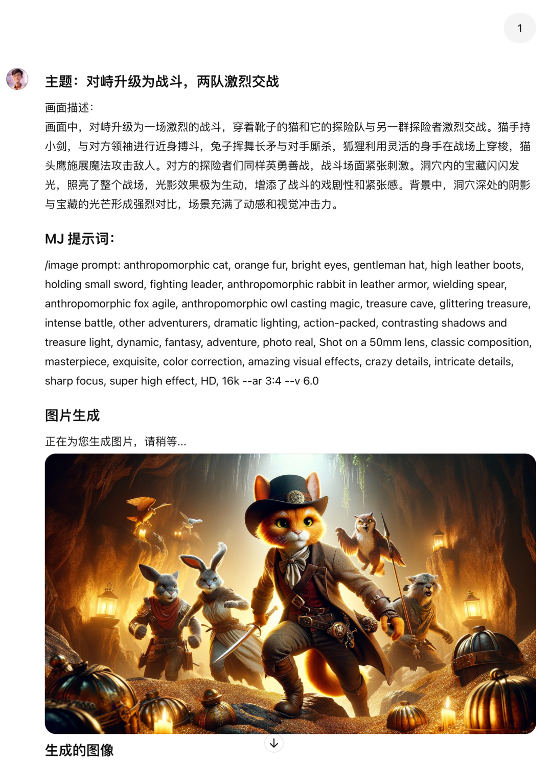 可以连续生成 4 张图(现在模型受限无法完成) 规避 DALL-E 的版权限制(比如生成皮卡丘,皮克斯风格等) 每张图的前面会生成 Midjourney 提示词 生成的提示词比官方版本风格更多样 每个图像后面生成 4 个衍生想法。