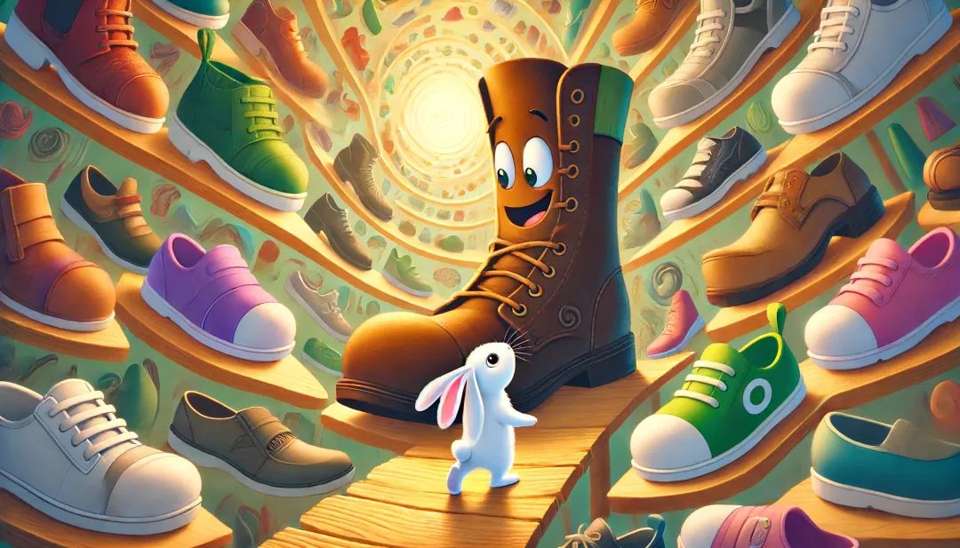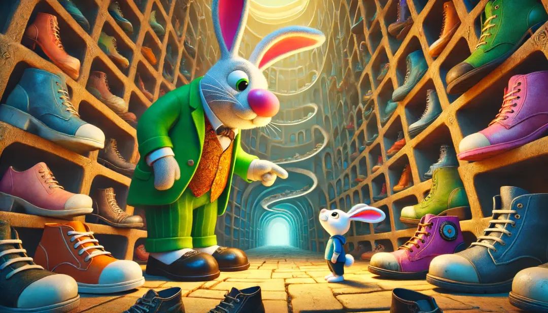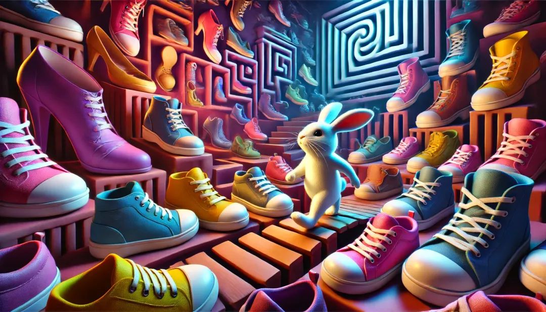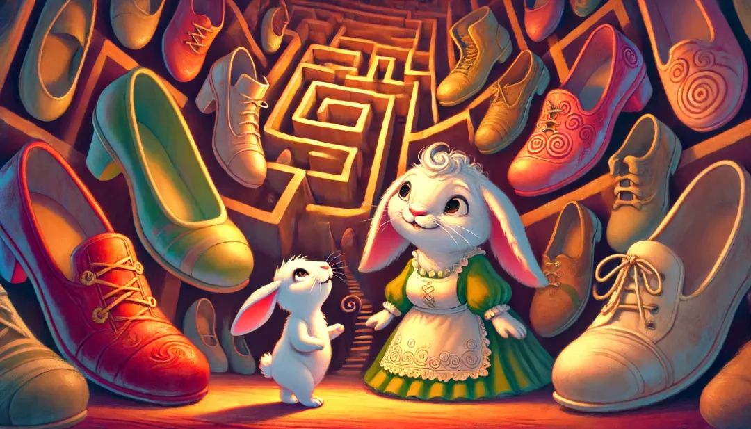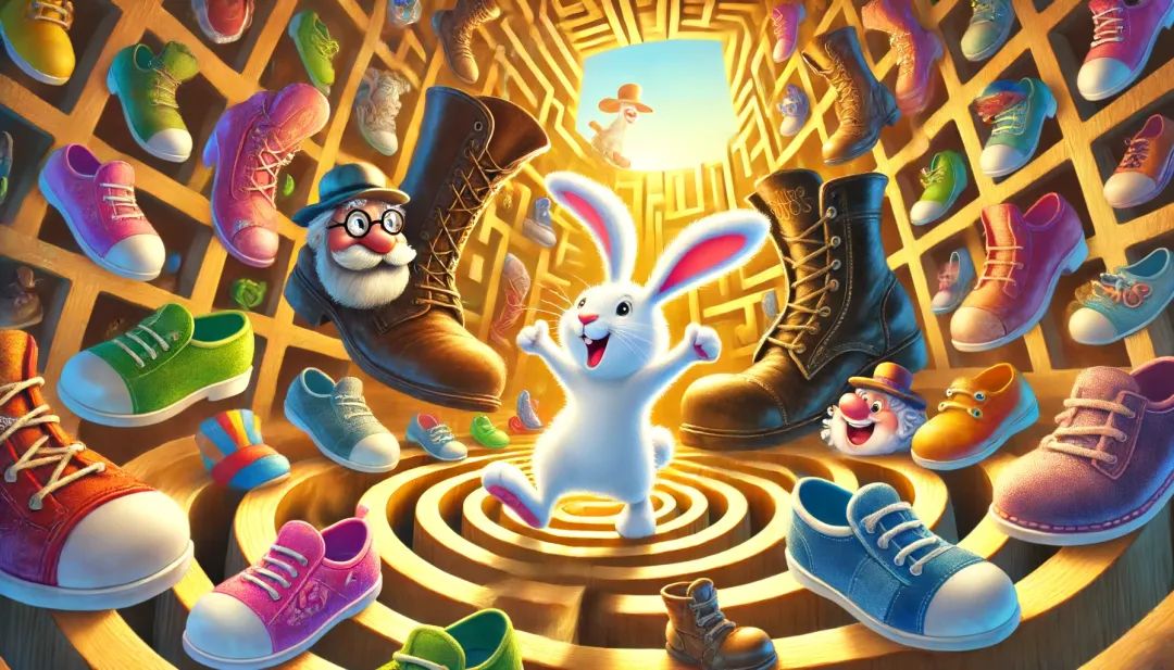 发现隐藏路线小白兔发现了一条由色彩缤纷的鞋子组成的隐藏路线,充满了探索的好奇和兴奋。